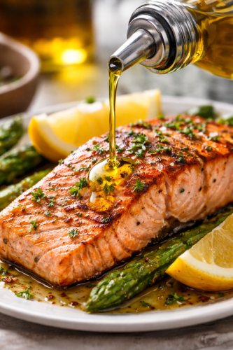 O Fogo Baixo: Leve ao forno pré-aquecido a 160°C (fogo baixo). O segredo é não deixar o azeite ferver, apenas “cozinhar” o peixe lentamente por cerca de 25 a 30 minutos.