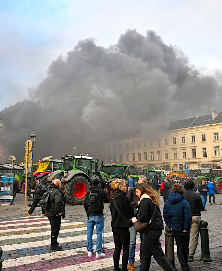 Centenas de agricultores que se opõem ao tratado dirigiram tratores até a capital da Bélgica, buzinando e dando cobertura aos manifestantes que atiravam projéteis contra a polícia.