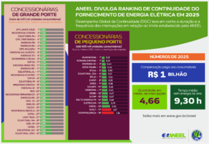 A ANEEL avaliou todas as concessionárias do país no período de janeiro a dezembro de 2025, divididas em dois grupos: concessionárias de grande porte, com número de unidades consumidoras maior que 400 mil; e concessionárias de menor porte, com o número de unidades consumidoras menor ou igual a 400 mil.