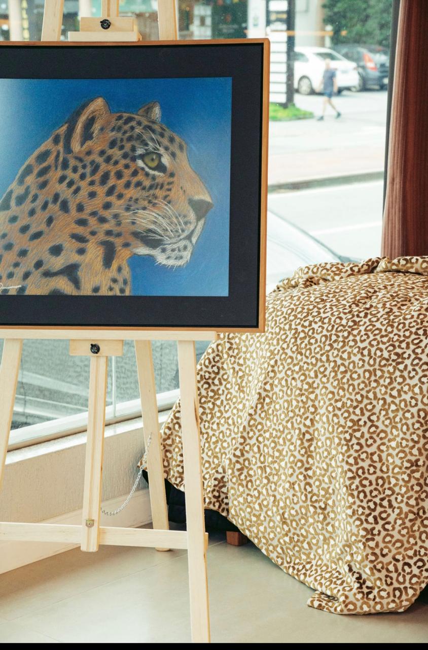 “A exposição foi a convite das responsáveis pelo espaço, que, ao saberem que eu era daqui, tiveram muita curiosidade de saber mais sobre o Estado e entenderam que os arquitetos e apreciadores de arte de Florianópolis gostam de coisas brasileiras em seus projetos. Quando eu falei que morava perto do Pantanal, falaram que seria interessante trabalhar em cima desse tema. Por isso criei esse nome, ‘Do Pântano para a Ilha’, e coloquei nas telas elementos como as flores de aguapé, as árvores do Cerrado, as onças, que são meu carro-chefe”, resume Lúcia.