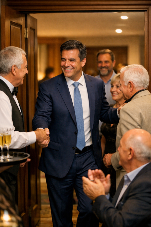 O empresário que interrompe a própria narrativa para acolher quem se aproxima. A convidada que agradece a equipe do evento com naturalidade. A personalidade que dedica o mesmo tempo ao patrocinador e a alguém que acabou de conhecer. Nada disso é performático — é construção de reputação.