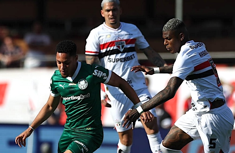A segunda etapa, no entanto, reservou uma reviravolta. O Verdão voltou com outra postura e começou a pressionar. Aos 24 minutos, Vitor Roque diminuiu. Recebendo cruzamento de Mauricio, o camisa 9 mergulhou de cabeça para acertar o canto de Rafael. Quatro minutos depois, Flaco López deixou tudo igual em um golaço, dominando na entrada da área e batendo colocado de esquerda, sem chances para o goleiro são-paulino.