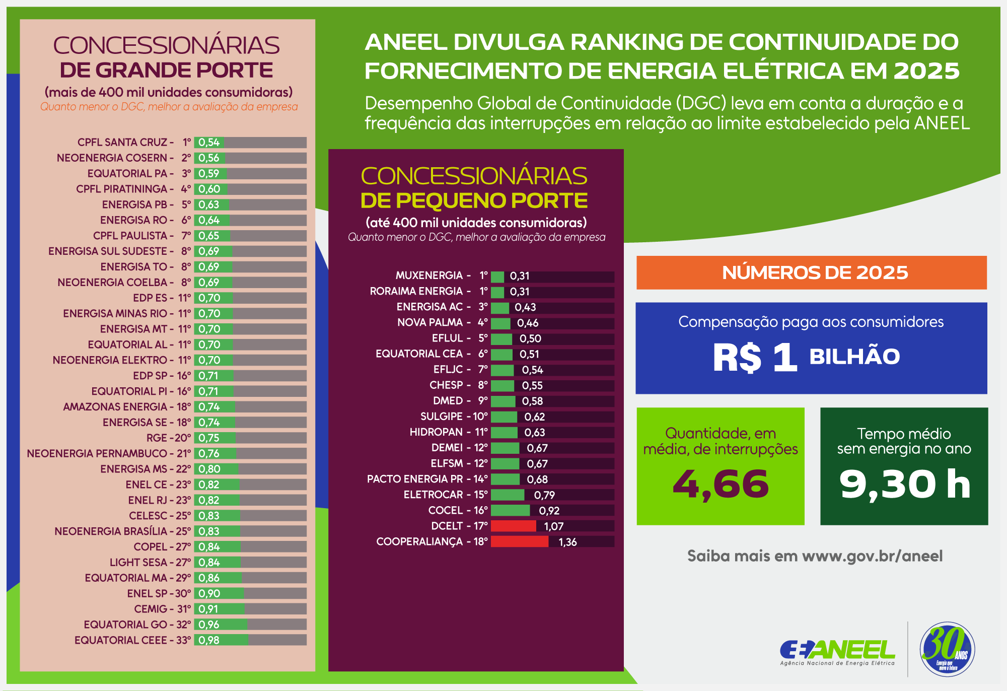 O desempenho engloba os números de Duração e Frequência de interrupções observados em 2025, o ranking das distribuidoras e as compensações pagas aos consumidores pelas empresas por extrapolarem os limites individuais de duração e frequência de interrupções.