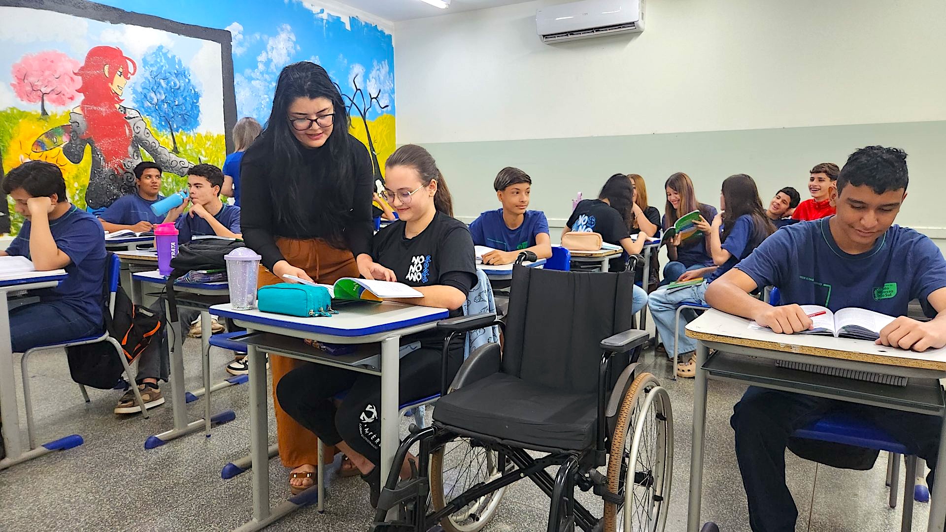 “Quando eu tinha 11 anos, descobri uma doença degenerativa e passei a precisar de cadeira de rodas. Aqui na escola, eu me sinto acolhida. Os professores sempre me ajudam, principalmente minha professora de apoio, que está comigo todos os dias. Eu gosto de vir para cá porque me sinto parte de tudo. Já aprendi muita coisa e estou mais confiante, minha professora de apoio me estimula e me motiva”, frisa.