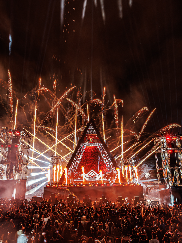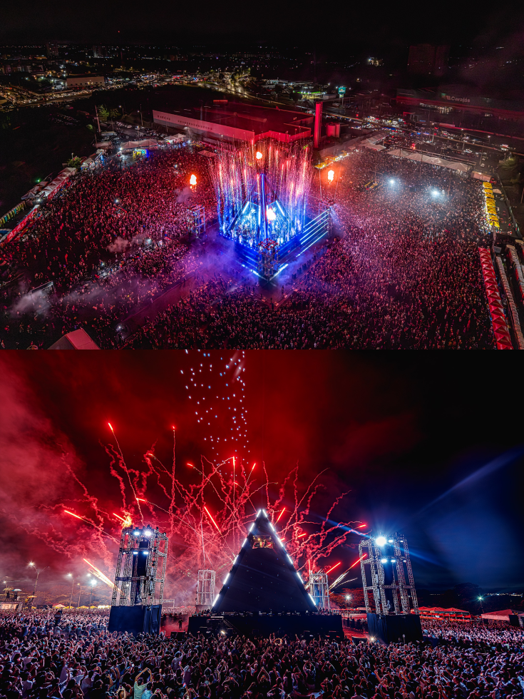 … A estrutura impressionou: uma pirâmide de 30 metros de altura, equipada com mais de 600 m² de painéis de LED e centenas de equipamentos de luz, transformou-se em protagonista do show. A cada batida, luzes e imagens criavam uma experiência imersiva, elevando o padrão das apresentações ao vivo no país.
